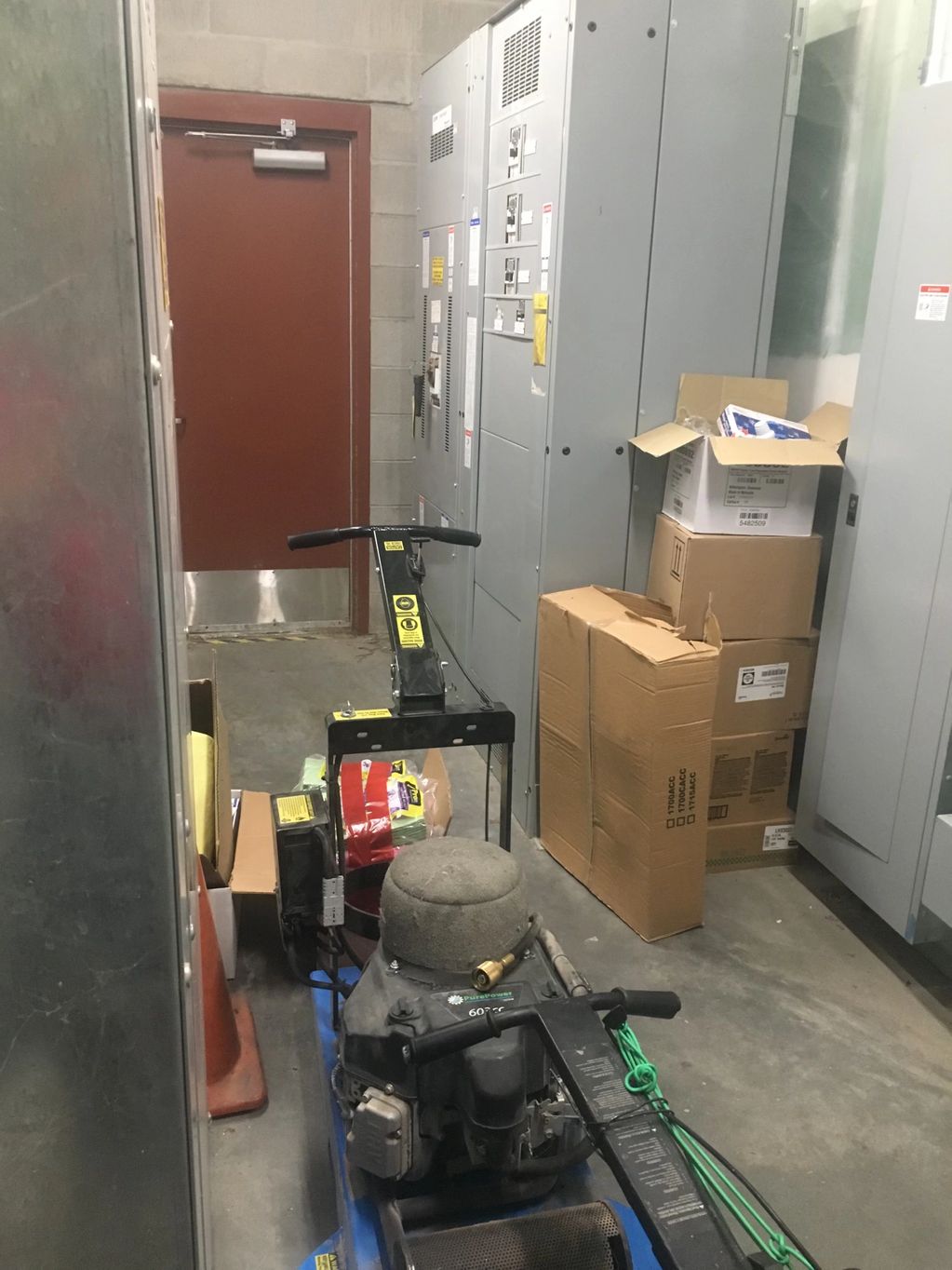 Propane storage as well as boxes in an electrical room is just ignorance in search of a disaster.